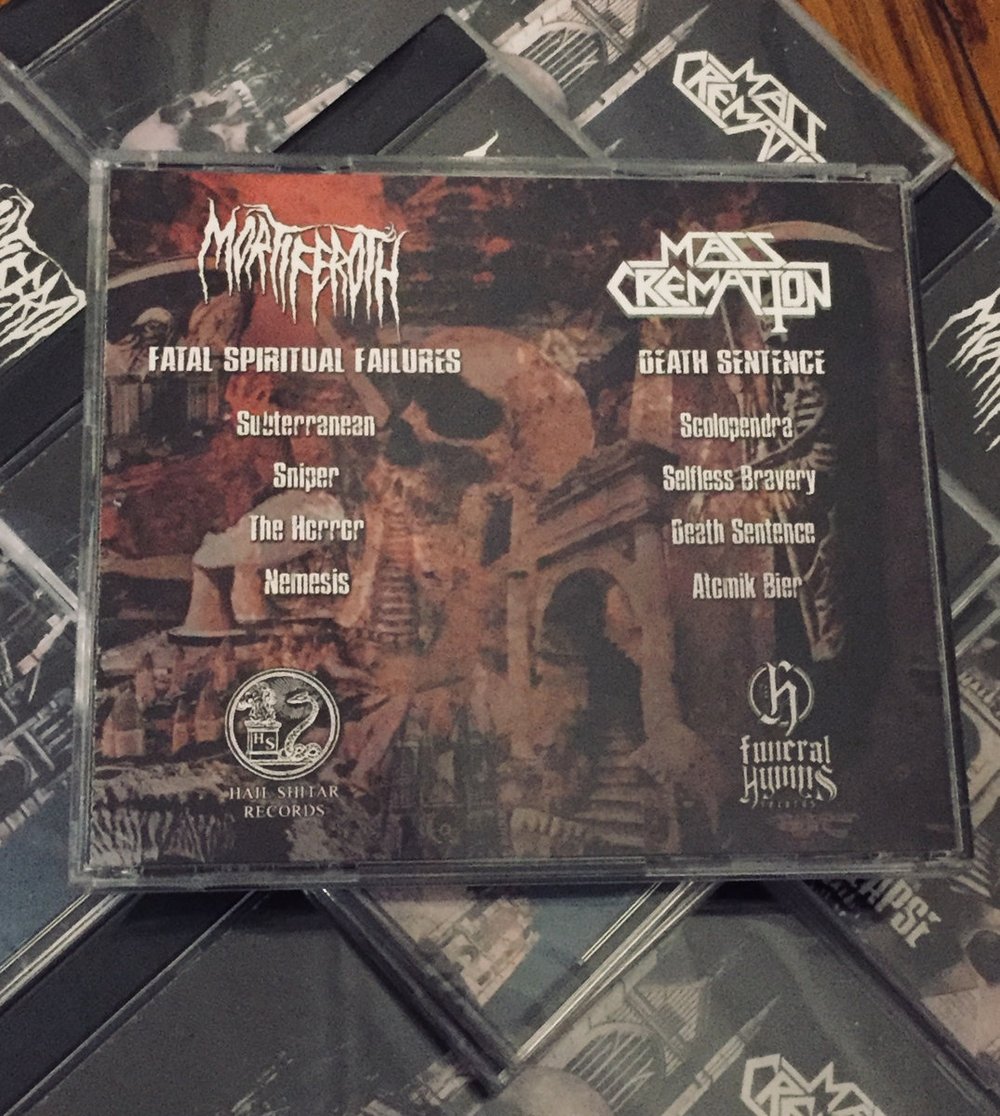Funeral Hymns Records (Canada) and Hail Shitar Records (USA) are proud to present: "The Collapse" Split CD featuring the Fatal Spiritual Failures EP from Mortiferoth (Queens, NYC; tracks 1-4) and the Death Sentence EP from Mass Cremation (Varna, Bulgaria; tracks 5-8). Mortiferoth disorients you with their furious, creepy death metal featuring dual vocals and tripped out guitars; and then Mass Cremation's thrashing death metal assault slices you up with ripping guitars and chainsaw riffs. Pro - CD, jewel case. Limited to 300 worldwide.