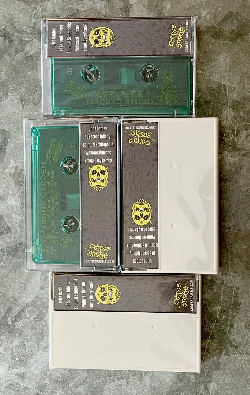 Corpse Gristle Records cassette reissue of SKELETON OF GOD's 1993 EP, wherein they provide 5 tracks of ear-blistering insanity that will leave you beyond bewildered and mesmerized with its unique twisted guttural vocals, trippy time changes and pummeling blast beats. It manages to look as unhinged as it is, too, which is nice. We have 2 Green and 2 ( I assume) Yellow.