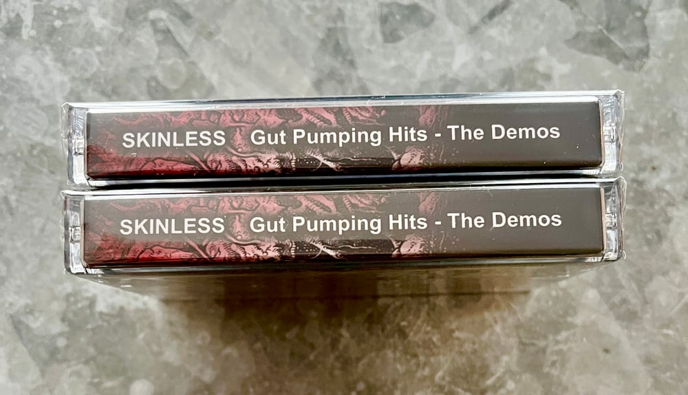 Gut Pumping Hits contains most of SKINLESS' demo material on one slick cassette; the classic Swollen Heaps demo from 1995 and the 1994 Demo. Comes packaged in a full color 3-panel J-card with three color variants. Limited to 150 total. (40 pink, 50 red, 60 smoky - We have 1 Red and 1 Smoky). From Corpse Gristle Records!!